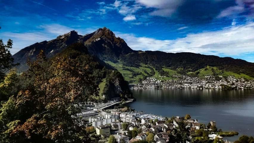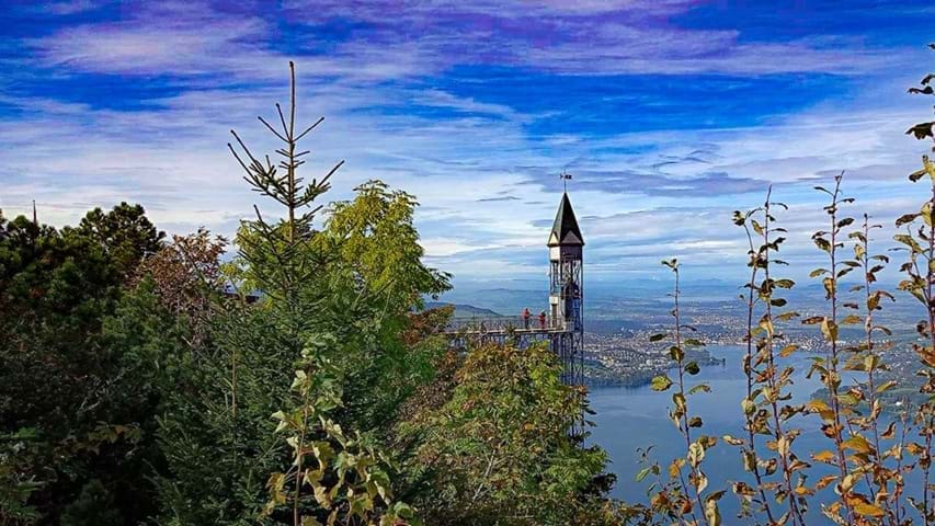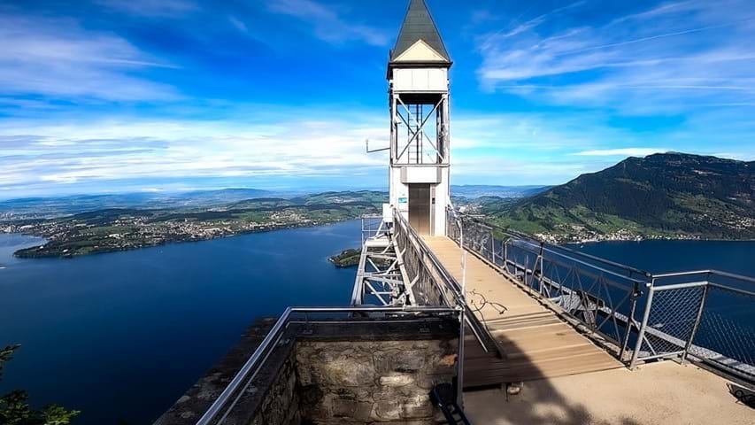 Hoch über dem glitzernden Vierwaldstättersee thront dieses eindrucksvolle Ausflugsziel und bietet ein Panorama, das einem den Atem raubt – mit Sicht auf die Zentralschweizer Alpen, das Mittelland und bei guter Fernsicht bis in den Schwarzwald.